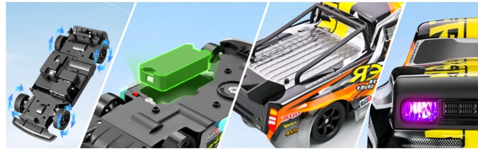 - Excellent off-road performance: the four-wheel drive with its amazing off-road capability makes it easier to perform difficult movements. Perfect for ground, rocky roads, meadows, mud, rugged mountain roads made of stone, etc. The structure houses the splash-proof electronics to support all-weather driving regardless of snow, mud and water. Equipped with realistic LED headlights to detect the direction of travel and the terrain in low light for an incredible driving experience at night.