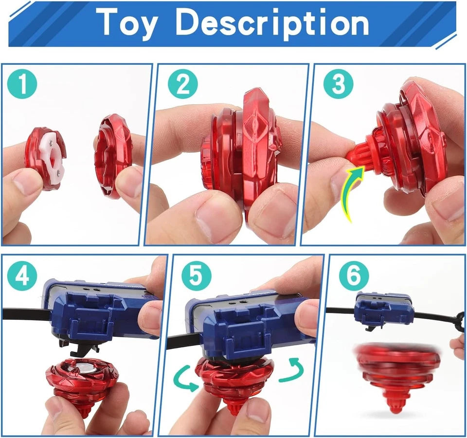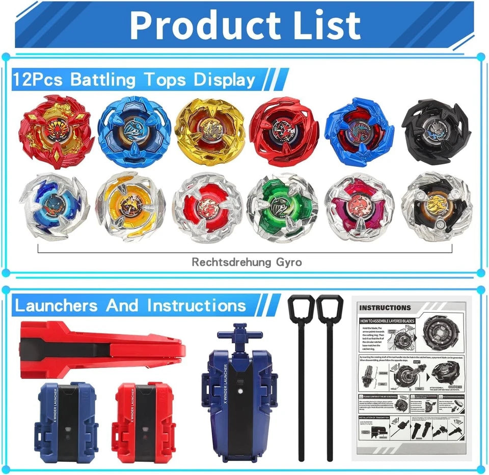 - Introducing the Battling Top Burst Gyro Toy Set, the perfect gift for kids and adults alike who love to engage in exciting battles and competitions with friends and family. This set comes with 12 burst tops, 3 launchers, and a firm portable storage box and instructions, making it easy to carry and play with anywhere you go.