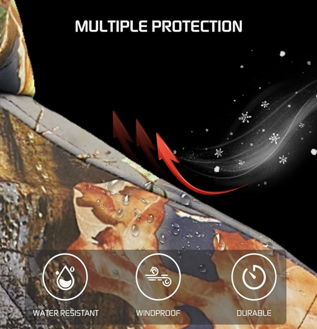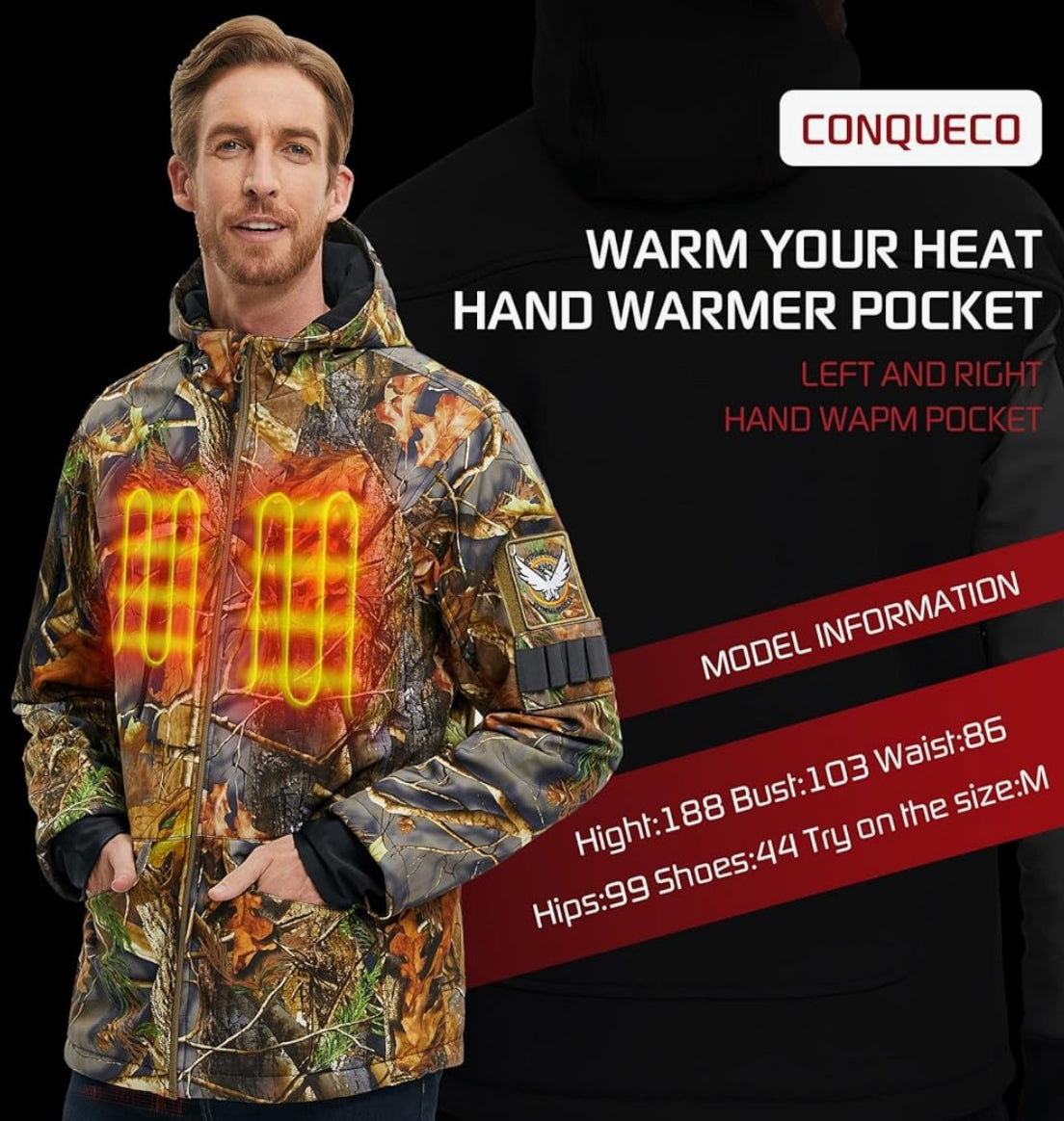 CONQUECO Men's Camo Heated Jacket Waterproof Hunting Hoodie Jacket with Battery Pack