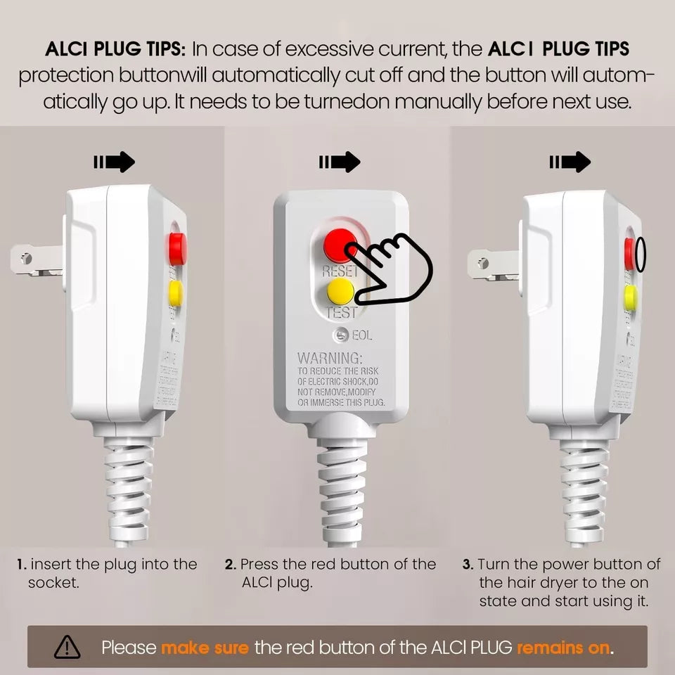 【Magnetic nozzle, More convenient【Safety ALCI Plug Keeps Red Button Pressed】ALCI safety plug for automatic leakage protection and overheat protection ensures your safety in all aspects.If the overheat protection does not work, cool down for 10 minutes before turning on the power, At the same time, keep the red button on the plug pressed.【0.1mm Inner Filter】The magnetic filter to prevent hair from entering the air duct. Please clean the filter regularly and use a soft cloth or soft brush to clean, not washable.