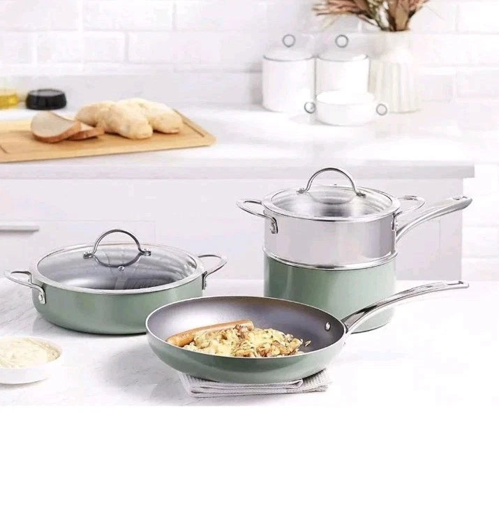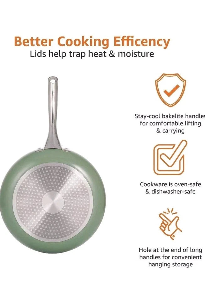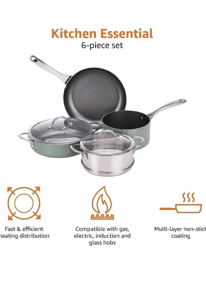 6-PIECE NON-STICK SET: Whole set comes with multiple layers of non-stick interior coating and pistachio-colored silicone-coated polyester exterior. Please use wooden/silicone utensils to maintain a longer non-stick performance